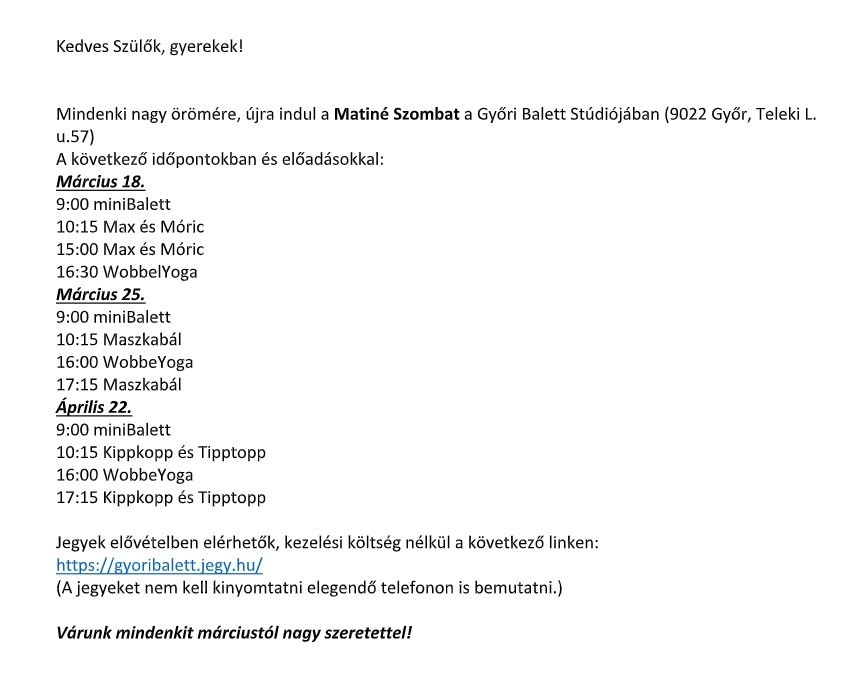 Matiné Szombat a Győri Balett szervezésében
